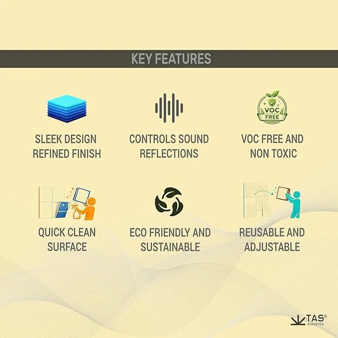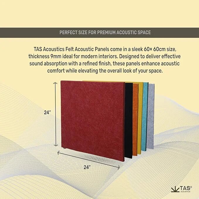 TAS® Felt Acoustic Panels are made from high-density PET felt to reduce echo and improve sound clarity in offices, bedrooms, and studios. Each panel measures 2 × 2 ft with a 9 mm thickness, offering effective sound absorption without adding bulk. Lightweight, durable, and easy to install, this set of 4 panels provides a clean, modern acoustic solution for focused and comfortable interiors.